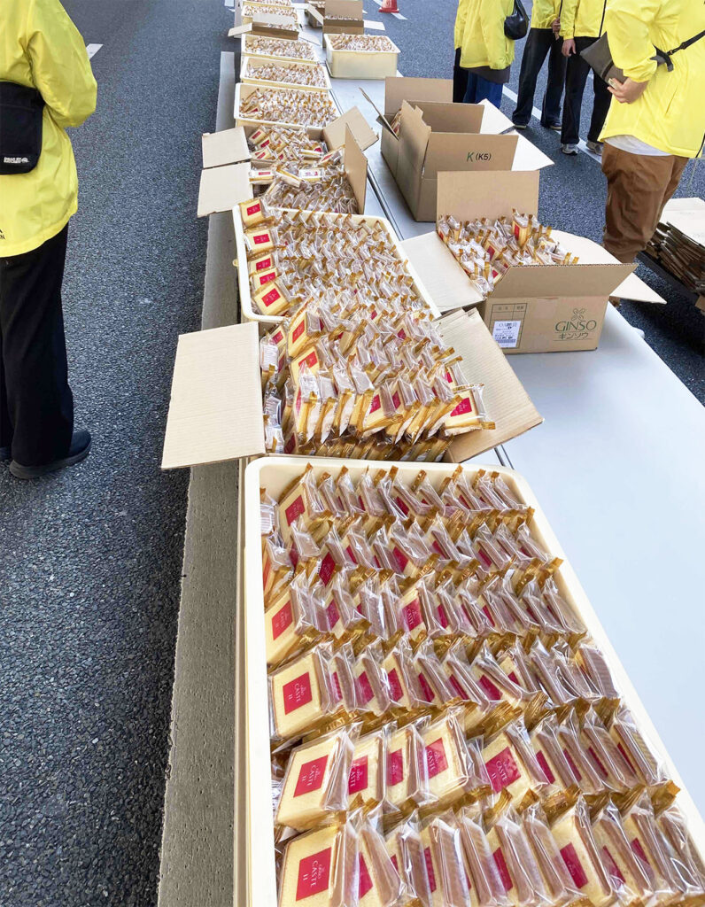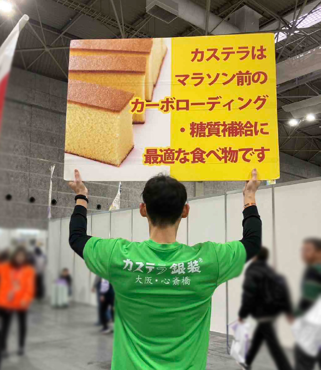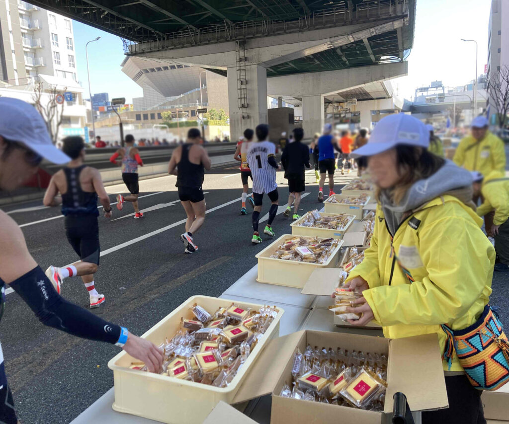 ランナーの方へ「個装カステラ赤箱」を配り、たくさんの方に食べて頂きました。