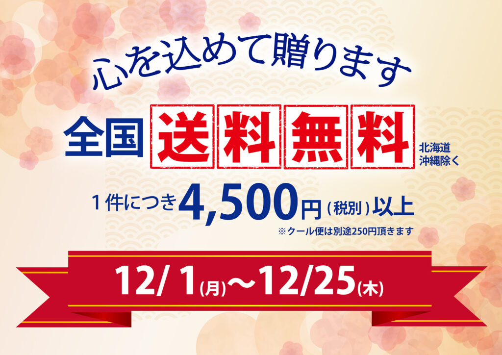 12月1日(月)~25日(木)まで 銀装直営店で1件につき4,500円以上ご購入のお客様へ送料無料キャンペーンを行います!お歳暮、帰省お土産、お年賀など、ぜひご利用くださいませ。