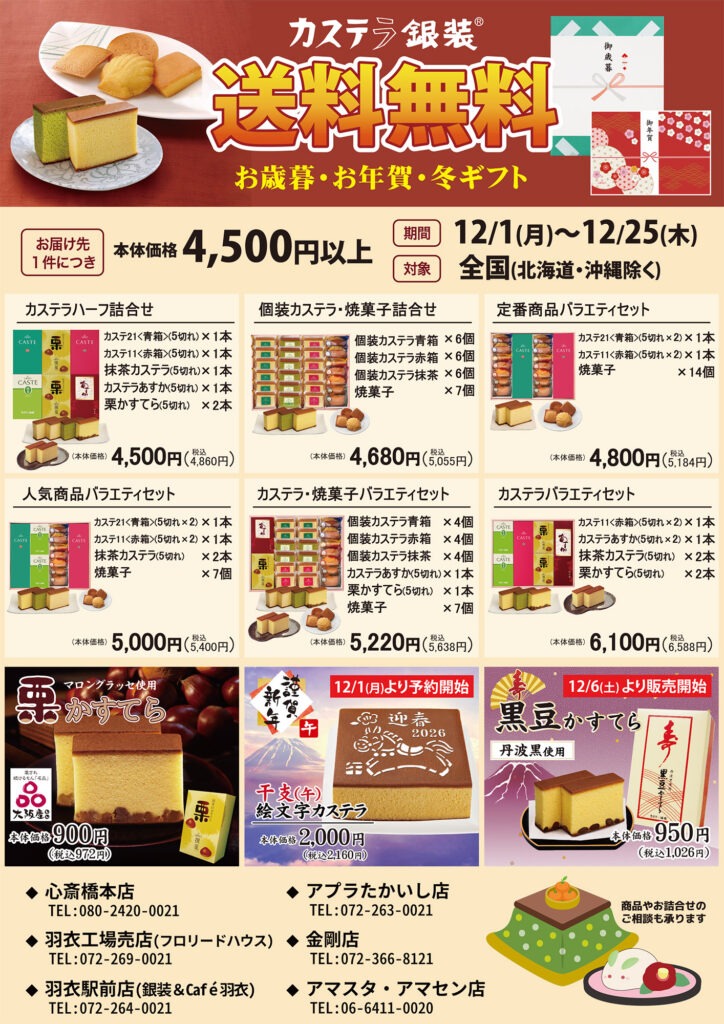 12月1日(月)~25日(木)まで 銀装直営店で1件につき4,500円以上ご購入のお客様へ送料無料キャンペーンを行います!お歳暮、帰省お土産、お年賀など、ぜひご利用くださいませ。