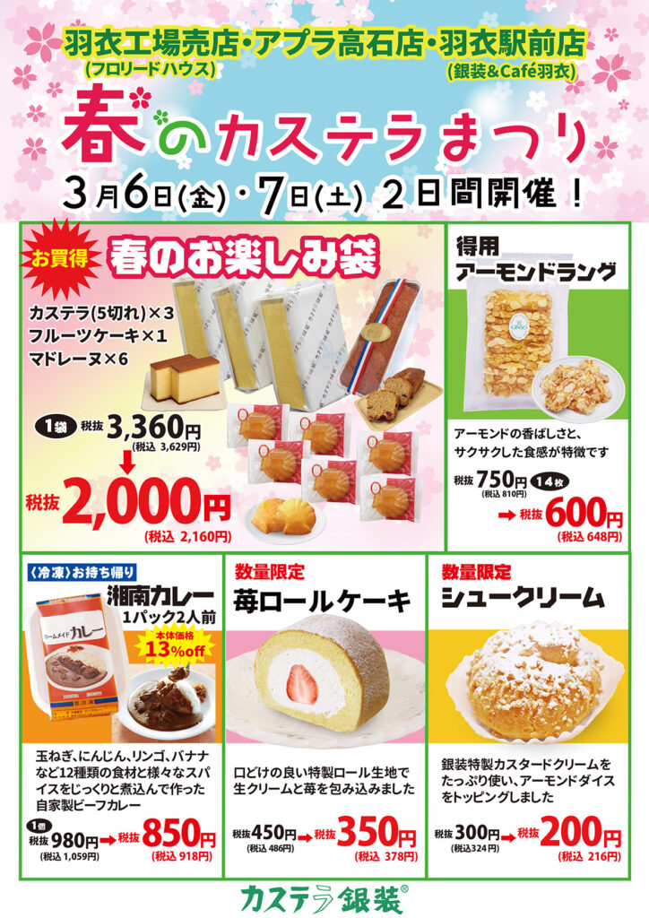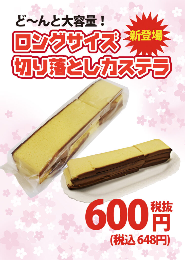 3月6日(金)・7日(土) フロリードハウス店、アプラたかいし店、銀装&Café羽衣の店で「春のカステラまつり」を開催します。いつもよりお買い得な商品を数多く取り揃えており、初登場となる大容量の「ロングサイズ 切り落としカステラ」も販売します。