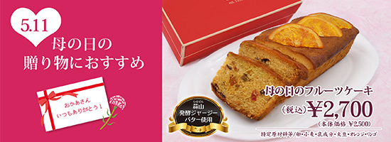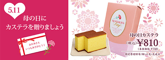 「母の日絵柄カステラ」、「母の日のフルーツケーキ」、「母の日カステラ」の販売をいたします。(一部店舗を除く)